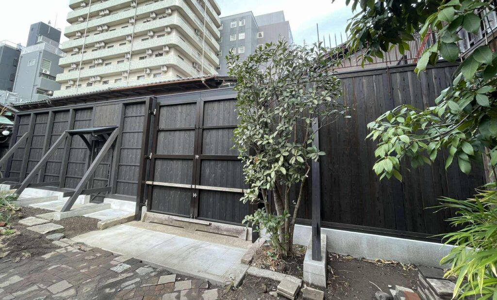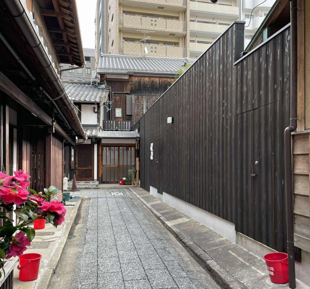 現在の主屋は元治の大火後に再建され、棟札によれば明治3年(1870年)4月23日に上棟。この時の当主は、第六代新左衛門為賢、棟梁は菱屋利三郎と近江屋五良右衛門でした。間口30メートル、奥行52メートルの敷地に建つ主屋は、表通りに面する店舗部と裏の居室部を取合部でつなぐ「表屋造り」で、京格子に出格子、大戸、犬矢来、そして厨子二階に開けた土塗りのむしこ窓など、すべてが昔ながらの典型的な京町家のたたずまいです。町家としては市内最大規模で、各一間半の床と棚を装置した座敷、独立棟として西に張り出した仏間、大きな台所などに特色著しいものがあり、また主屋の北寄りには、元治の大火に焼け残ったと伝えられる大蔵・隅蔵・中蔵が鍵型に並びます。保存状況は良好で、下京における大店の建築遺構として、きわめて高い価値を有します。また、祇園祭に際しては、当町伯牙山のお飾り場になります。
